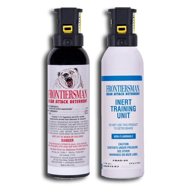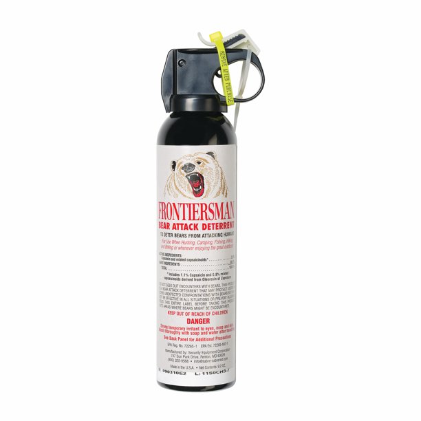 Sabre frontiersman bear spray 9 2 oz holster options multi pack options maximum strength maximum range greatest protective barrier per burst.